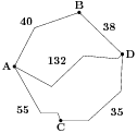 Из пункта A в пункт D ведут три дороги. Через пункт B едет грузовик со средней скоростью 52 км/ч, через пункт C едет автобус со средней скоростью 40 км/ч. Третья дорога — без промежуточных пунктов, и по ней движется легковой автомобиль со средней скоростью 66 км/ч. На рисунке показана схема дорог и расстояние между пунктами по дорогам.