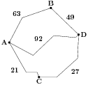 Из пункта A в пункт D ведут три дороги. Через пункт B едет грузовик со средней скоростью 64 км/ч, через пункт C едет автобус со средней скоростью 48 км/ч. Третья дорога — без промежуточных пунктов, и по ней движется легковой автомобиль со средней скоростью 46 км/ч. На рисунке показана схема дорог и расстояние между пунктами по дорогам.