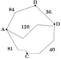 Из пункта A в пункт D ведут три дороги. Через пункт B едет грузовик со средней скоростью 60 км/ч, через пункт C едет автобус со средней скоростью 44 км/ч. Третья дорога — без промежуточных пунктов, и по ней движется легковой автомобиль со средней скоростью 48 км/ч. На рисунке показана схема дорог и расстояние между пунктами по дорогам.