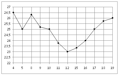 На рисунке жирными точками показана цена нефти на момент закрытия биржевых торгов во все рабочие дни с 4 по 19 апреля 2002 года. По горизонтали указываются числа месяца, по вертикали — цена барреля нефти в долларах США. Для наглядности жирные точки на рисунке соединены линией. Определите по рисунку, какого числа цена нефти на момент закрытия торгов была наибольшей за данный период.
