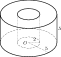 Объем данной фигуры равен разности объемов цилиндра с радиусом основания 5 и высотой 5 и цилиндра с той же высотой и радиусом основания 2: