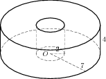 Объем данной фигуры равен разности объемов цилиндра с радиусом основания 5 и высотой 5 и цилиндра с той же высотой и радиусом основания 2: