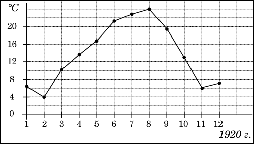 На рисунке жирными точками показана среднемесячная температура воздуха в Сочи за каждый месяц 1920 года. По горизонтали указываются месяцы, по вертикали - температура в градусах Цельсия. Для наглядности жирные точки соединены линией. Определите по рисунку разность между наибольшей и наименьшей среднемесячными температурами за указанный период. Ответ дайте в градусах Цельсия.