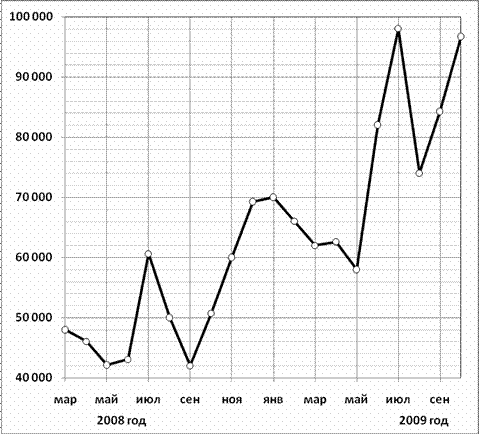 На рисунке жирными точками показано количество запросов со словом ЖАРА, сделанных на поисковом сайте Yandex.ru во все месяцы с марта 2008 по октябрь 2009 года. По горизонтали указываются месяцы, по вертикали — количество запросов за данный месяц. Для наглядности жирные точки на рисунке соединены линией. Определите по рисунку наименьшее месячное количество запросов со словом ЖАРА с января по октябрь 2009 года.