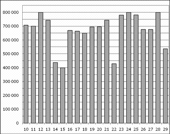 На диаграмме показано количество посетителей сайта РИА Новости во все дни с 10 по 29 ноября 2009 года. По горизонтали указываются дни месяца, по вертикали — количество посетителей сайта за данный день. Определите по диаграмме разность наибольшего и наименьшего количества посетителей за день в данный период.