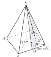 Версия для печати и копирования в MS WordВ правильной четырёхугольной пирамиде SABCD высота SO равна 13, диагональ основания BD равна 8. Точки К и М — середины рёбер CD и ВС соответственно. Найдите тангенс угла между плоскостью SMK и плоскостью основания ABC.