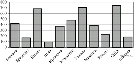 Версия для печати и копирования в MS WordНа диаграмме показано распределение выплавки цинка (в тысячах тонн) в 11 странах мира за 2009 год. Среди представленных стран первое место по выплавке цинка занимали США, одиннадцатое место — Иран. Какое место занимала Канада?