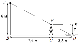 Версия для печати и копирования в MS WordЧеловек стоит на расстоянии 7,6 м от столба, на котором висит фонарь, расположенный на высоте 6 м. Длина тени человека равна 3,8 м. Какого роста человек (в метрах)?