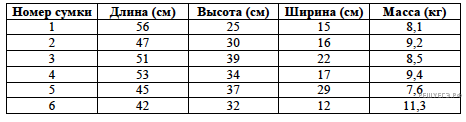 В таблице приведены данные о шести сумках.