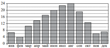 Версия для печати и копирования в MS WordНа диаграмме показана среднемесячная температура воздуха в Сочи за каждый месяц 1920 года. По горизонтали указываются месяцы, по вертикали — температура в градусах Цельсия. Определите по диаграмме наименьшую среднемесячную температуру в Сочи во второй половине 1920 года. Ответ дайте в градусах Цельсия.