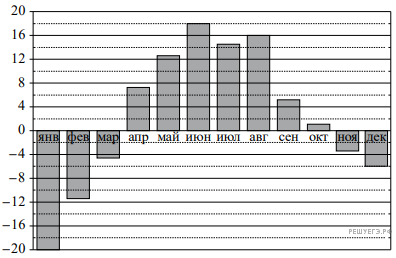 Версия для печати и копирования в MS WordНа диаграмме показана среднемесячная температура воздуха в Екатеринбурге (Свердловске) за каждый месяц 1973 года. По горизонтали указываются месяцы, по вертикали — температура в градусах Цельсия. Определите по диаграмме наименьшую среднемесячную температуру в Екатеринбурге (Свердловске) во второй половине 1973 года. Ответ дайте в градусах Цельсия.