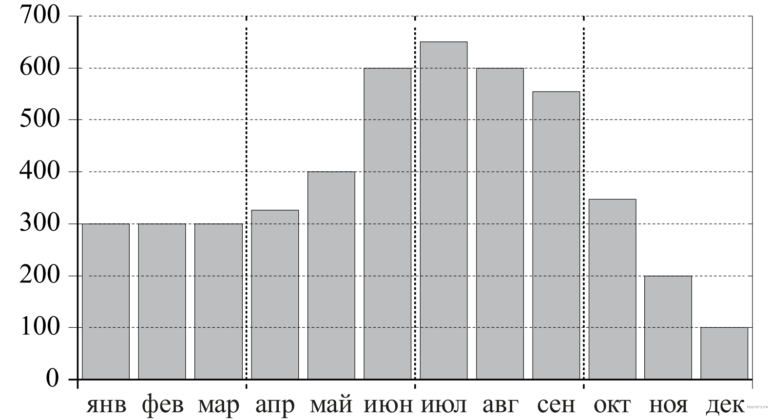 На диаграмме изображены объёмы месячных продаж холодильников в магазине бытовой техники. По горизонтали указываются месяца, по вертикали — количество проданных холодильников.