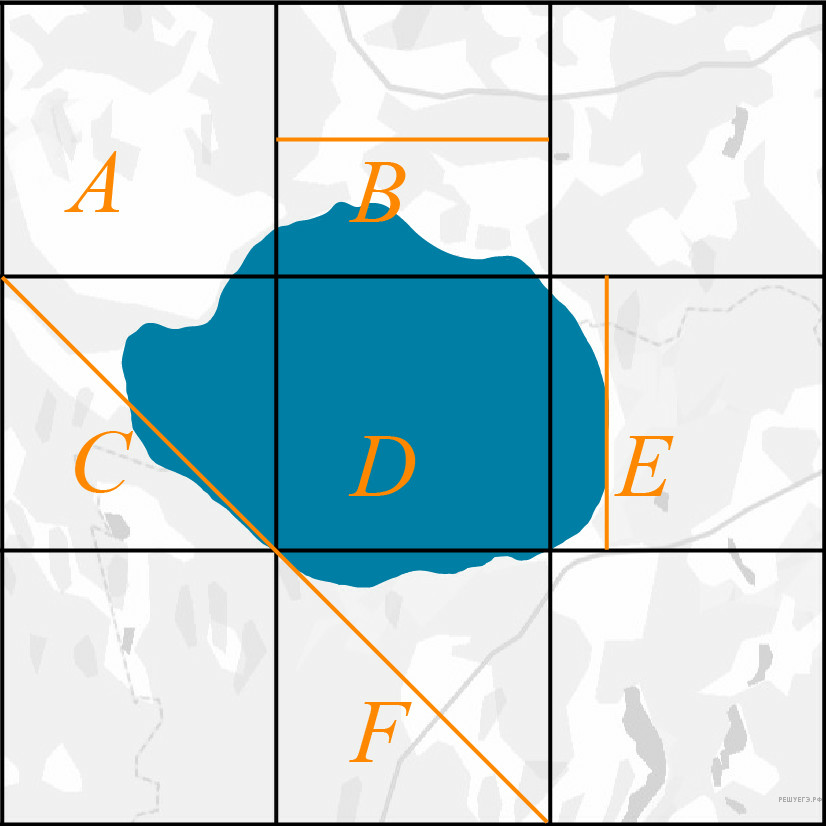 Площадь озера в квадрате В немного меньше половины площади квадрата, а сумма площадей озера в квадратах E и F заметно меньше половины площади квадрата. Перенесем части озера из квадратов E и F в квадрат В, этим он будет почти заполнен наполовину.