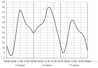 На рисунке показано изменение температуры воздуха на протяжении трех суток. По горизонтали указывается дата и время суток, по вертикали — значение температуры в градусах Цельсия. Определите по рисунку наибольшую температуру воздуха 13 июля. Ответ дайте в градусах Цельсия.