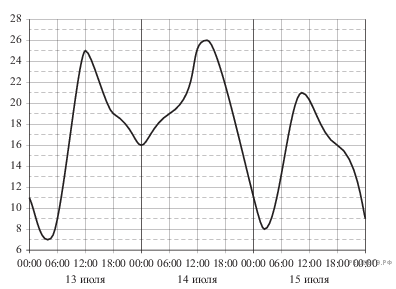 На рисунке показано изменение температуры воздуха на протяжении трех суток. По горизонтали указывается дата и время суток, по вертикали — значение температуры в градусах Цельсия. Определите по рисунку наибольшую температуру воздуха 15 июля. Ответ дайте в градусах Цельсия.