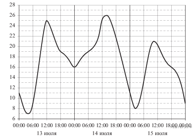 На рисунке показано изменение температуры воздуха на протяжении трех суток. По горизонтали указывается дата и время суток, по вертикали — значение температуры в градусах Цельсия. Определите по рисунку наименьшую температуру воздуха 15 июля. Ответ дайте в градусах Цельсия.