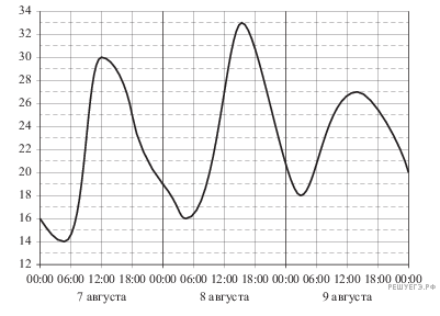 На рисунке показано изменение температуры воздуха на протяжении трех суток. По горизонтали указывается дата и время суток, по вертикали — значение температуры в градусах Цельсия. Определите по рисунку наименьшую температуру воздуха 9 августа. Ответ дайте в градусах Цельсия.