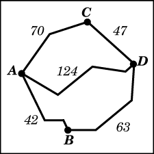 Из пункта А в пункт D ведут три дороги. Через пункт В едет грузовик со средней скоростью 42 км/ч, через пункт С едет автобус со средней скоростью 52 км/ч. Третья дорога — без промежуточных пунктов, и по ней движется легковой автомобиль со средней скоростью 62 км/ч. На рисунке показана схема дорог и расстояние между пунктами по дорогам.