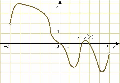 На ри­сун­ке изоб­ра­жен гра­фик функ­ции y = f(x), опре­де­лен­ной на ин­тер­ва­ле (−5; 5). Най­ди­те ко­ли­че­ство точек, в ко­то­рых ка­са­тель­ная к гра­фи­ку функ­ции па­рал­лель­на пря­мой y  =  6 или сов­па­да­ет с ней.