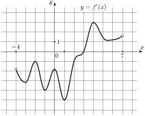 На рисунке изображен график производной функции f(x), определенной на интервале (−8; 4). В какой точке отрезка [−7; −3] f(x) принимает наименьшее значение?