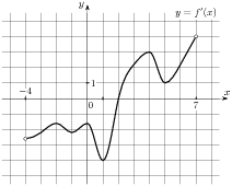 На рисунке изображен график производной функции f(x), определенной на интервале (−8; 4). В какой точке отрезка [−7; −3] f(x) принимает наименьшее значение?