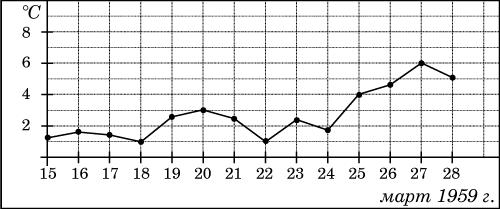 На рисунке жирными точками показана среднесуточная температура воздуха в Пскове каждый день с 15 по 28 марта 1959 года. По горизонтали указываются числа месяца, по вертикали - температура в градусах Цельсия. Для наглядности жирные точки соединены линией. Определите по рисунку, сколько дней из данного периода среднесуточная температура была больше 2 градусов Цельсия.