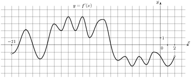На рисунке изображен график производной функции f(x), определенной на интервале (−7; 14). Найдите количество точек максимума функции f(x) на отрезке [−6; 9].