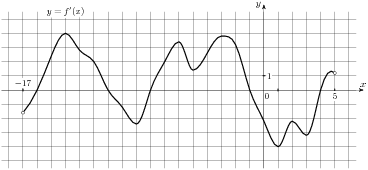 На рисунке изображен график производной функции f(x), определенной на интервале (−7; 14). Найдите количество точек максимума функции f(x) на отрезке [−6; 9].