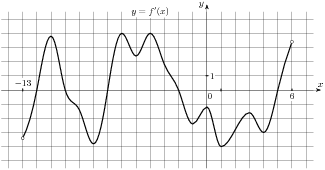 На рисунке изображен график производной функции f(x), определенной на интервале (−7; 14). Найдите количество точек максимума функции f(x) на отрезке [−6; 9].