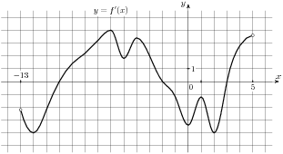 На рисунке изображен график производной функции f(x), определенной на интервале (−7; 14). Найдите количество точек максимума функции f(x) на отрезке [−6; 9].