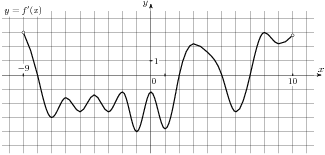На рисунке изображен график производной функции f(x), определенной на интервале (−7; 14). Найдите количество точек максимума функции f(x) на отрезке [−6; 9].