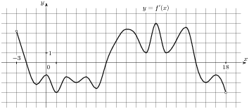 На рисунке изображен график производной функции f(x), определенной на интервале (−18; 6). Найдите количество точек минимума функции f(x) на отрезке [−13; 1].