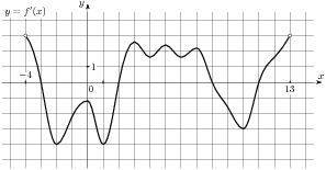 На рисунке изображен график производной функции f(x), определенной на интервале (−7; 14). Найдите количество точек максимума функции f(x) на отрезке [−6; 9].