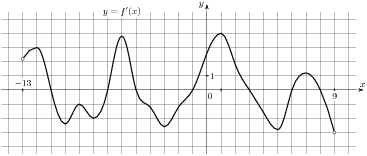 На рисунке изображен график производной функции f(x), определенной на интервале (−7; 14). Найдите количество точек максимума функции f(x) на отрезке [−6; 9].
