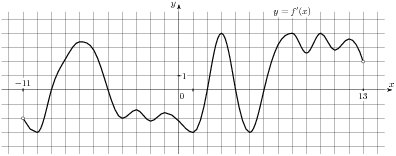 На рисунке изображен график производной функции f(x), определенной на интервале (−7; 14). Найдите количество точек максимума функции f(x) на отрезке [−6; 9].