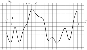 На рисунке изображен график производной функции f(x), определенной на интервале (−7; 14). Найдите количество точек максимума функции f(x) на отрезке [−6; 9].