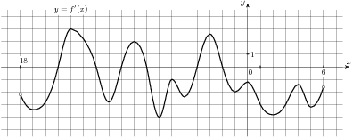На рисунке изображен график производной функции f(x), определенной на интервале (−7; 14). Найдите количество точек максимума функции f(x) на отрезке [−6; 9].
