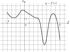 Промежутки возрастания данной функции f(x) соответствуют промежуткам, на которых ее производная положительна, то есть интервалам (−7; −5,5), (−2,5; 4). Данные интервалы содержат целые точки −6, −2, −1, 0, 1, 2, 3. Их сумма равна −3.