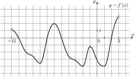 На рисунке изображен график производной функции f(x), определенной на интервале (−2; 12). Найдите промежутки убывания функции f(x). В ответе укажите длину наибольшего из них.