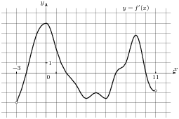 На рисунке изображен график производной функции f(x), определенной на интервале (−11; 3). Найдите промежутки возрастания функции f(x). В ответе укажите длину наибольшего из них.