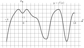 На рисунке изображен график производной функции f(x), определенной на интервале (−2; 12). Найдите промежутки убывания функции f(x). В ответе укажите длину наибольшего из них.