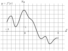 Если производная в некоторой точке равна нулю, а в ее окрестности меняет знак, то это точка экстремума. На отрезке [−2; 6] график производной пересекает ось абсцисс, производная меняет знак с плюса на минус. Следовательно, точка 4 является точкой экстремума.