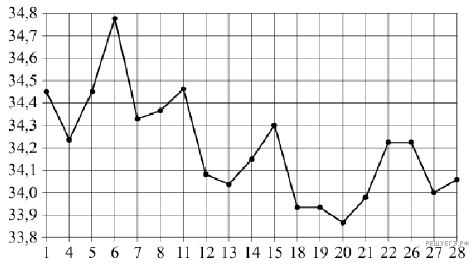 На рисунке жирными точками показан курс евро, установленный Центробанком РФ, во все рабочие дни с 1 февраля по 28 февраля 2003 года. По горизонтали указываются числа месяца, по вертикали — цена евро в рублях. Для наглядности жирные точки на рисунке соединены линиями. Определите по рисунку, какого числа курс евро был наименьшим за указанный период.