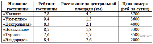 Любовь Игнатьевна собирается в туристическую поездку на трое суток в некоторый город. В таблице дана информация о гостиницах в этом городе со свободными номерами на время её поездки.