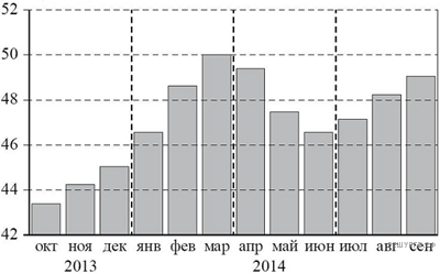 На диаграмме изображён среднемесячный курс евро в период с октября 2013 года по сентябрь 2014 года. По горизонтали указываются месяц и год, по вертикали — курс евро в рублях.
