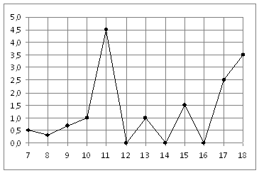 На рисунке жирными точками показано суточное количество осадков, выпадавших в Элисте с 7 по 18 декабря 2001 года. По горизонтали указываются числа месяца, по вертикали — количество осадков, выпавших в соответствующий день, в миллиметрах. Для наглядности жирные точки на рисунке соединены линией. Определите по рисунку, сколько дней из данного периода выпадало менее 2 миллиметров осадков.
