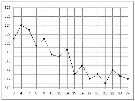 На рисунке жирными точками показано суточное количество осадков, выпадавших в Томске с 8 по 24 января 2005 года. По горизонтали указаны числа месяца, по вертикали — количество осадков, выпавших в соответствующий день, в миллиметрах. Для наглядности жирные точки на рисунке соединены линиями.