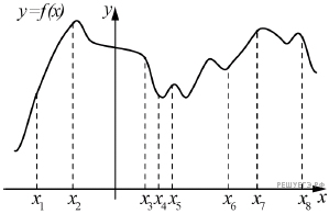 На рисунке изображён график функции y = f(x) и восемь точек на оси абсцисс: x1, x2, x3, …, x8. В скольких из этих точек производная функции f(x) положительна?