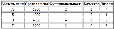 | Модель печи | Средняя цена | Функциональность | Качество | Дизайн |