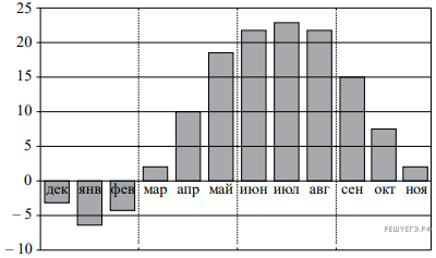 На диаграмме изображены дневные среднемесячные температуры воздуха в Москве по данным многолетних наблюдений. По горизонтали указываются месяцы, по вертикали — температура в градусах Цельсия.
